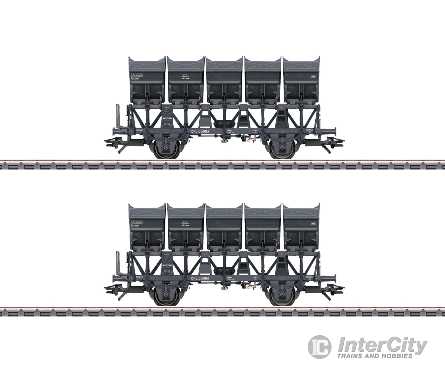 Prototype: 2 Luxembourg State Railways (CFL) type STCwf two-axle dump cars. Graphite gray basic paint scheme. Brakeman's stand and handbrake included. The cars look as they did at the end of the Fifties.