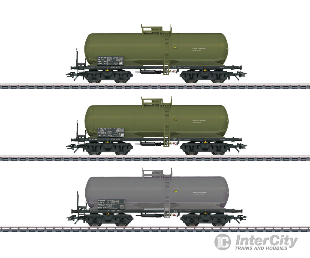 Prototype: Three Czechoslovakian State Railways (CSD) type Zaes (Rah) 4-axle tank cars. Reed green or dusty gray paint scheme. The cars look as they did around 1982.