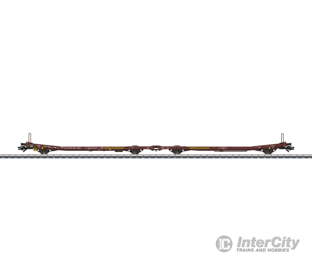 Model: Both flat car halves are constructed of metal. There are many separately applied details such as brake lines, air tanks, crossover plates, steps, and brake rigging. There is a handwheel for setting brakes. The buffer height conforms to the NEM. There is a rigid prototype coupling with a guide mechanism between the car halves. Chock blocks for the upper side of the cars, chock blocks for the car floors, and brake hoses are included as parts to be installed separately. Length over the buffers 32.4 cm / 12-3/4". DC wheelset E414237.