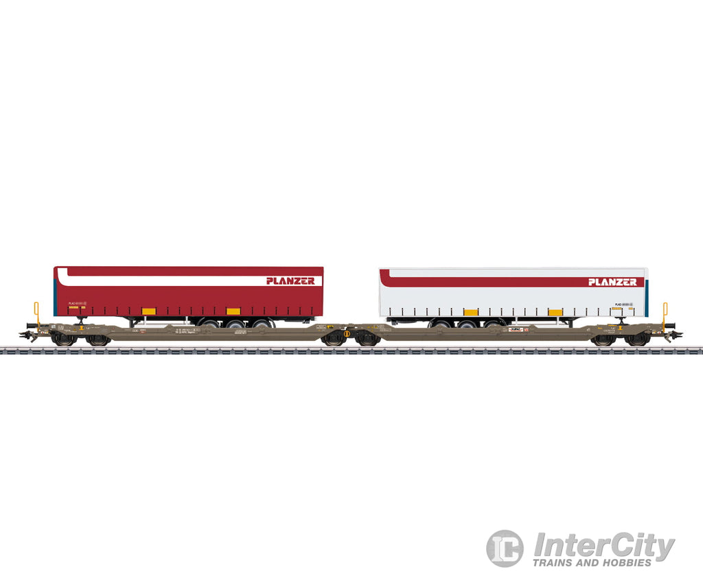 Prototype: Hupac AG type Sdggmrss (T3000e) six-axle double pocket car with articulation. Modern flat car for combined load service. Version with four side folding tie bars. The car looks as it did starting in 2019. Loaded with two curtain tarp semi-truck trailers lettered for the freight forwarder "Planzer".
