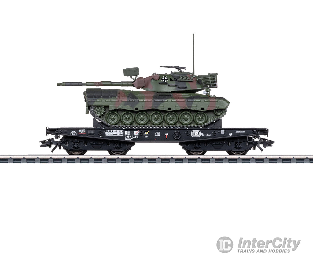 Model: The heavy-duty flat car frame is constructed of metal. Load restraints are included. The model of the Leopard 1A1 is constructed mostly of metal. Additional separately applied components such as the treads are made of detailed plastic. The turret and gun can be rotated. The unit is painted in camouflage. It is also lettered with identification markings. The military vehicle model is supplied by Schuco. Length over the buffers approximately 12.4 cm / 4-7/8".