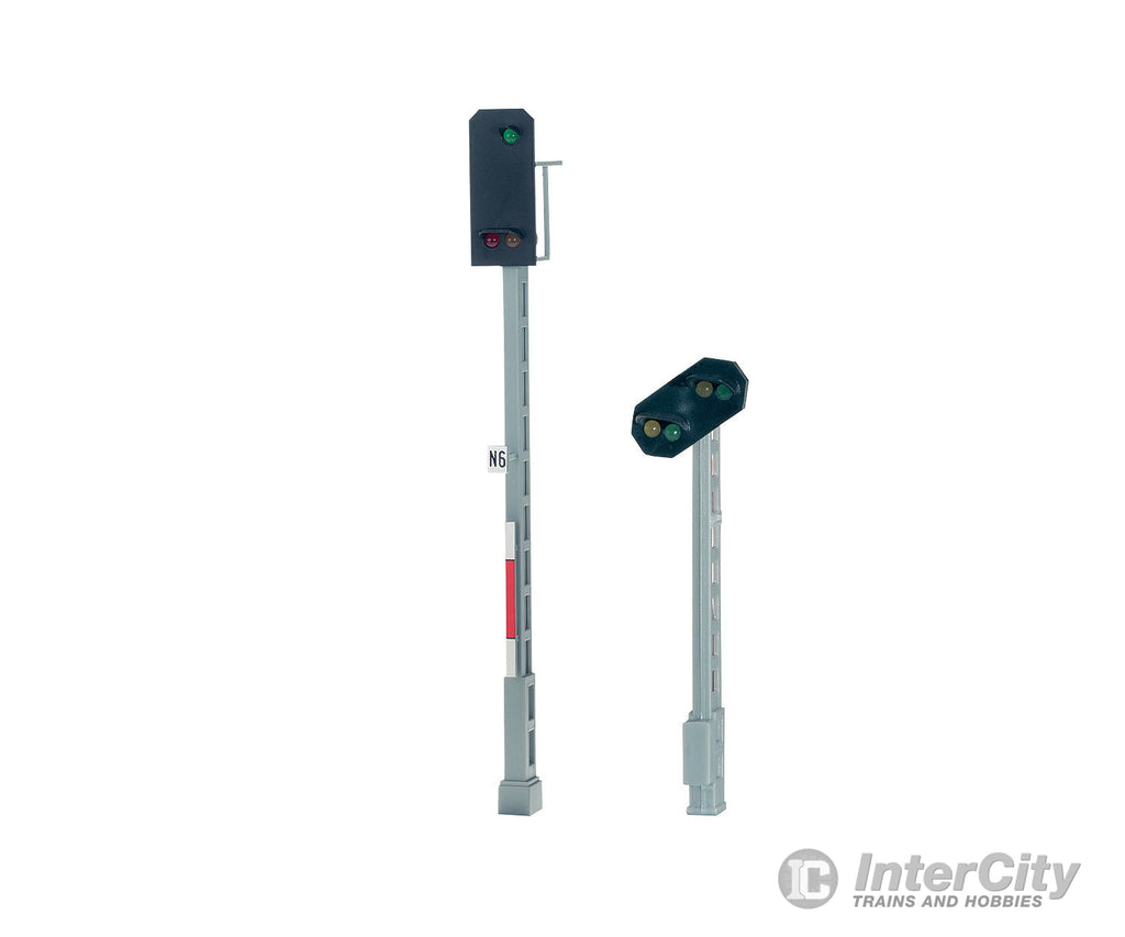 Set consisting of a home signal with one each green, red, and yellow LEDs to indicate the signal conditions of stop (Hp0), proceed (Hp1), and proceed slowly (Hp2), and a separate distant signal to go with the home signal. Both signals do not have a mechanism. An H0 mechanism or a Märklin Digital decoder can be used, depending on how the signals are to be used. This color light home signal and distant signal are not available separately.