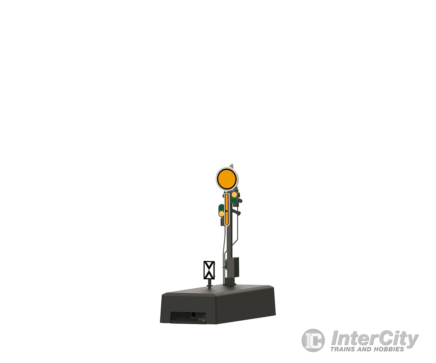The signal has a gray mast with a movable arm and movable disk. The signal changes from (Vr 0) to green/green (Vr 1) or to yellow/green (Vr 2). It has 2 servos.