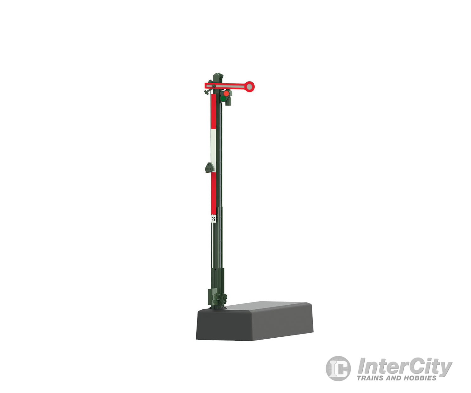 The signal has a semaphore and an open narrow mast. The signal changes from red to green.