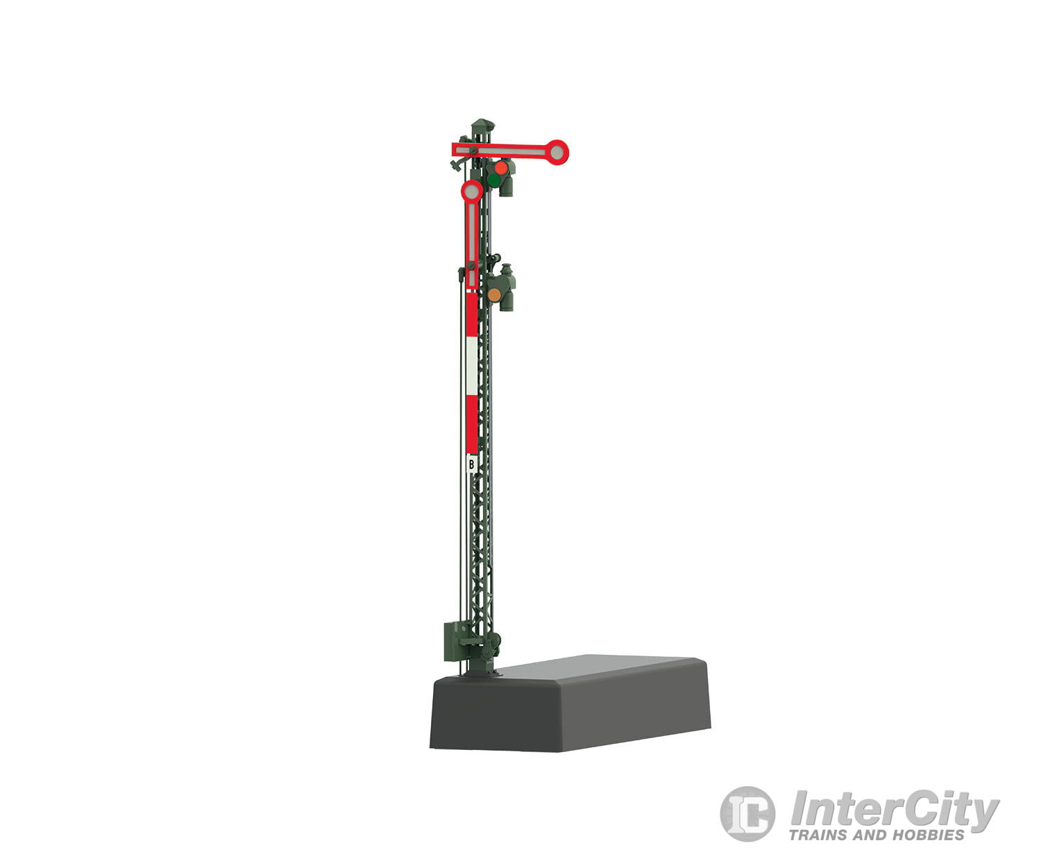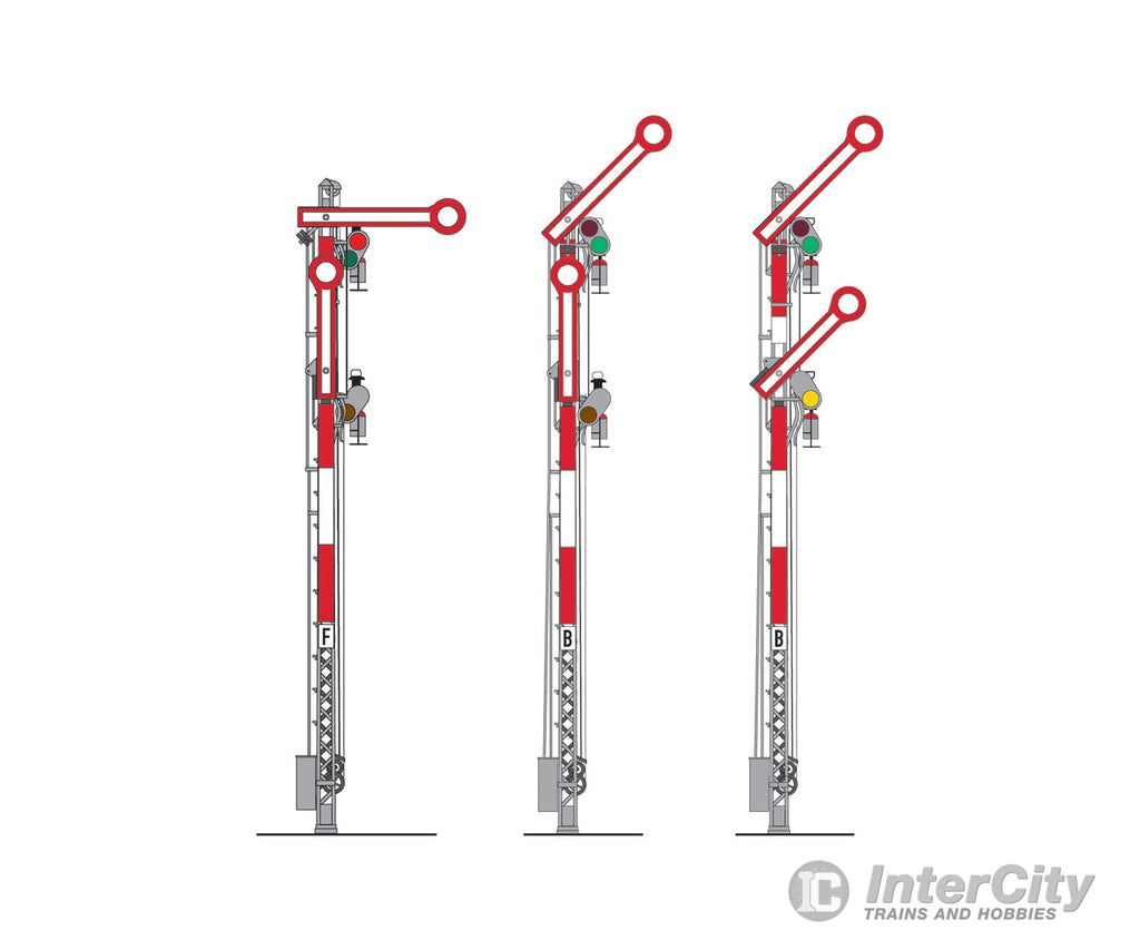 The signal has 2 independent semaphores and an open lattice mast. The signal changes from red to green or red to green/yellow.