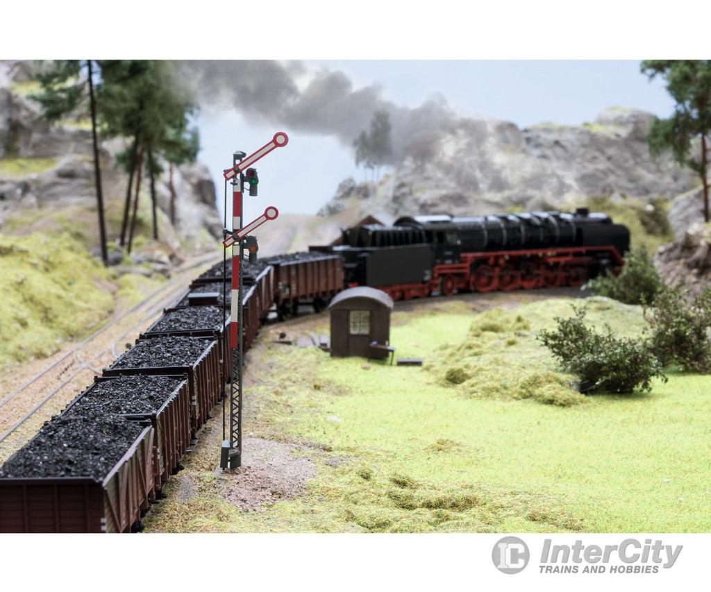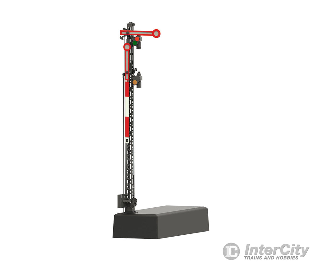 The signal has 2 independent semaphores and an open gray lattice mast. The signal changes from red (Hp 0) to green (Hp 1) or red (Hp 0) to green/yellow (Hp 2).