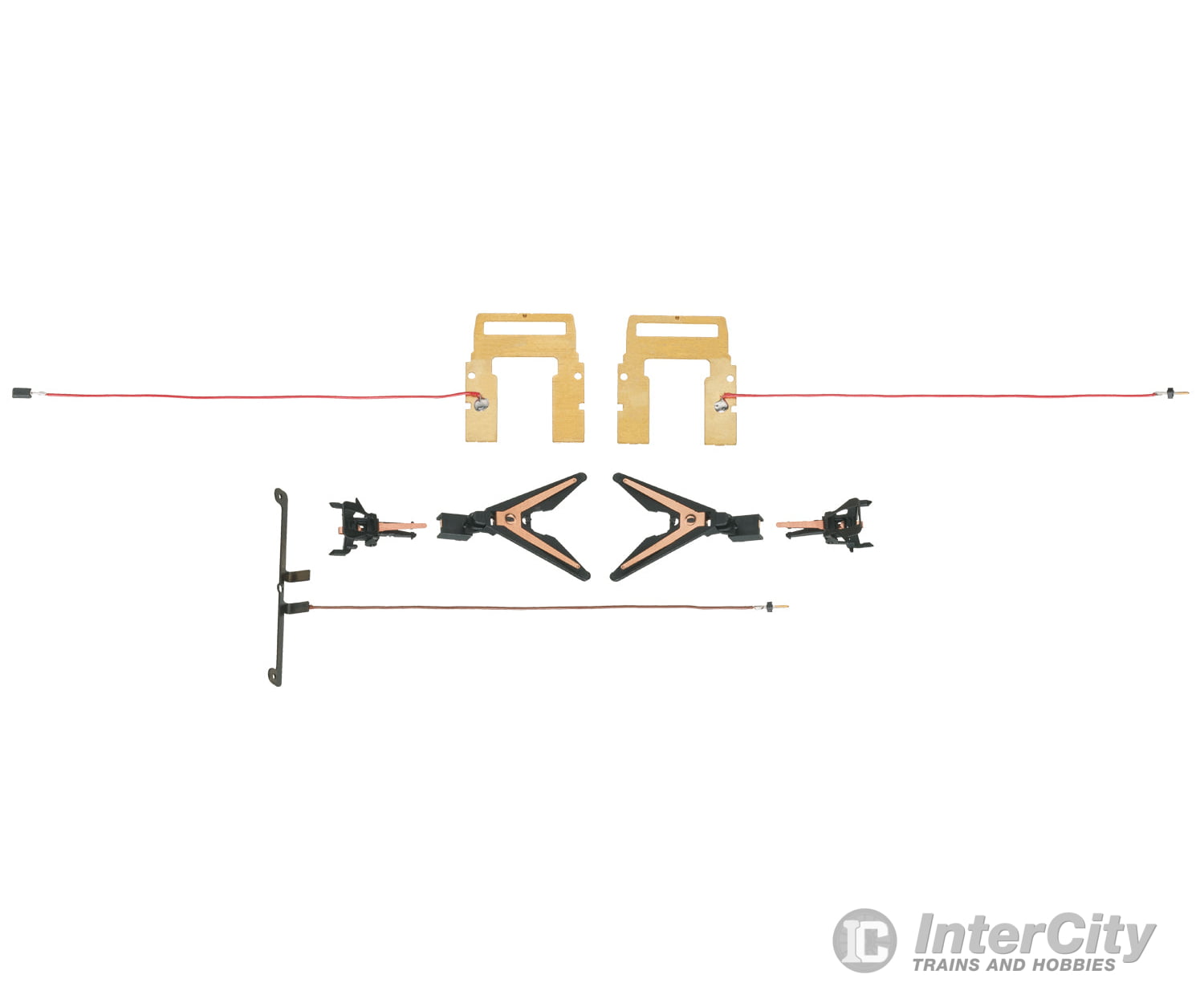 Contents: 2 current-carrying close coupling heads for standard coupling sockets with contacts, 2 coupling drawbars with built-in contact springs, 2 spacer plates with soldered cables, 1 ground spring for the bogie with soldered cable, installation instructions.