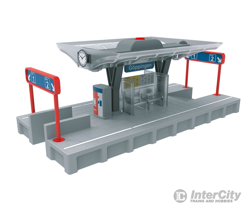 This snap-together kit is made of sturdy plastic. The station platform can be assembled easily from just a few parts by children ages 3 and up. In addition, the station platform has a battery-powered light function. A sheet of stickers, assembly instructions and 2 AAA batteries are included. Dimensions: 25 cm long x 11 cm wide x 10 cm high.