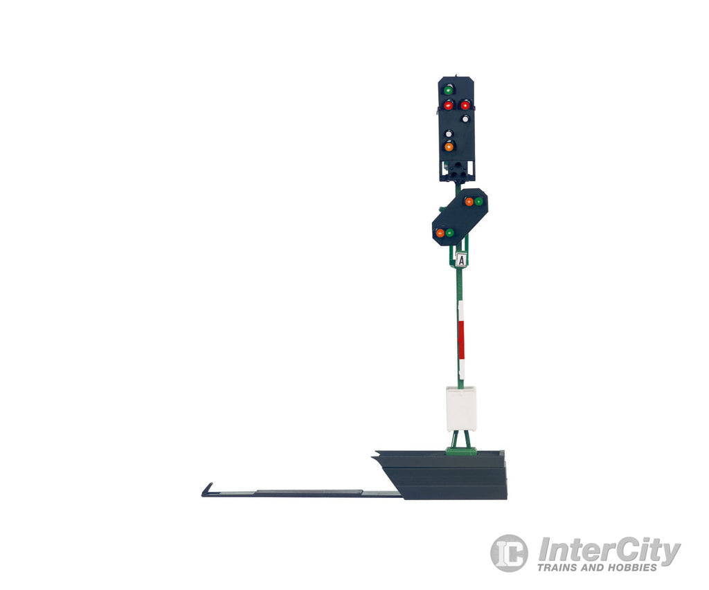 Model: The signal has 2 built-in electronic signal circuits and 1 separate signal decoder. The distant signal can be used for all home signals. Control of all functions is possible in the digital system with the signal decoder included with the signal, or in conventional operation with a 72760 control box. The signal decoder can be installed under C Track or under the layout. For digital operation, the configuration and the address can be assigned and tested before the installation of the signal. Connections for controlling train movements and for 1 additional distant signal are on the signal decoder. Height without base 78.0 mm /3-1/16".