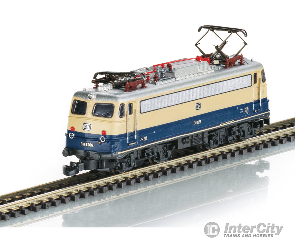 Prototype: German Federal Railroad (DB) class E 10.12 electric locomotive. With the "Bügelfalten" / "Pants Crease" ends, continuous ventilation bands, continuous rain gutter, and buffer cladding. B-B wheel arrangement. Beige/cobalt blue paint scheme. The locomotive looks as it did around 1962/1963.