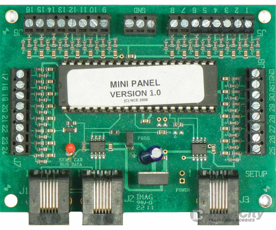 Build your control panels with greatly simplified wiring. Just connect push buttons to the Mini Panel and use to issue turnout routing macros, individual turnout commands by pushing one button. Set up is easy, just plug in a Pro Cab (sold separately) and answer menu questions. For all NCE DCC systems.