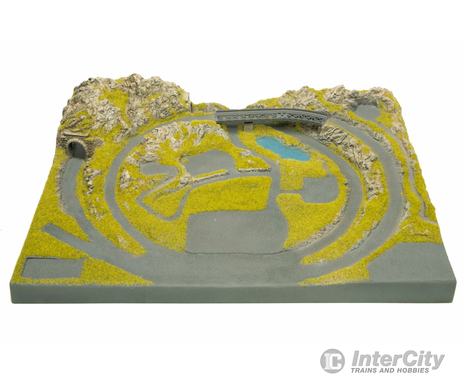 The diorama, made of structured hard foam, pre-painted and covered with grass, is a real eyecatcher! The appropriate bridge and a track plan are included.