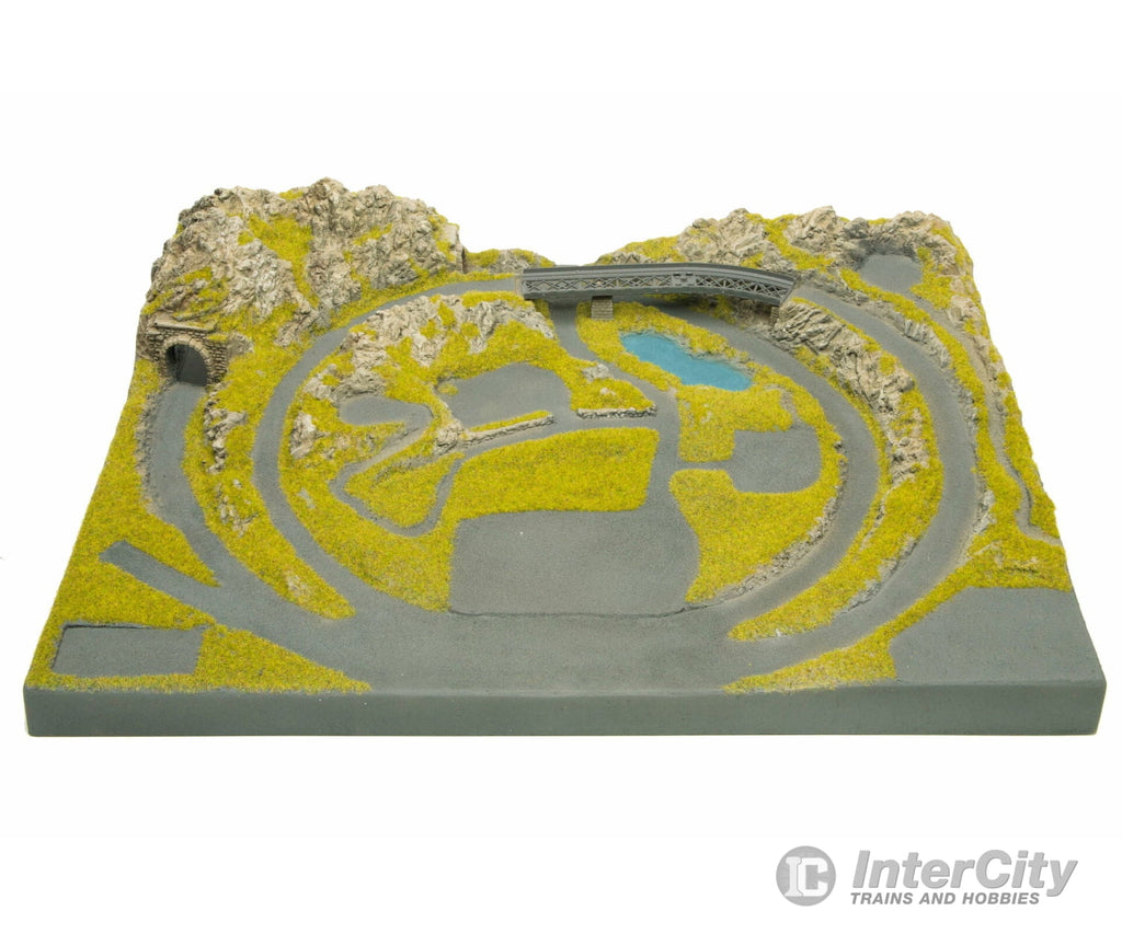 The beautiful little Z-gauge summer terrain inspires with a varied route over a bridge and through a tunnel. The trains makes its rounds on a railway circuit. A typical Alpine village can be built in the centre of this pretty Z-gauge layout.