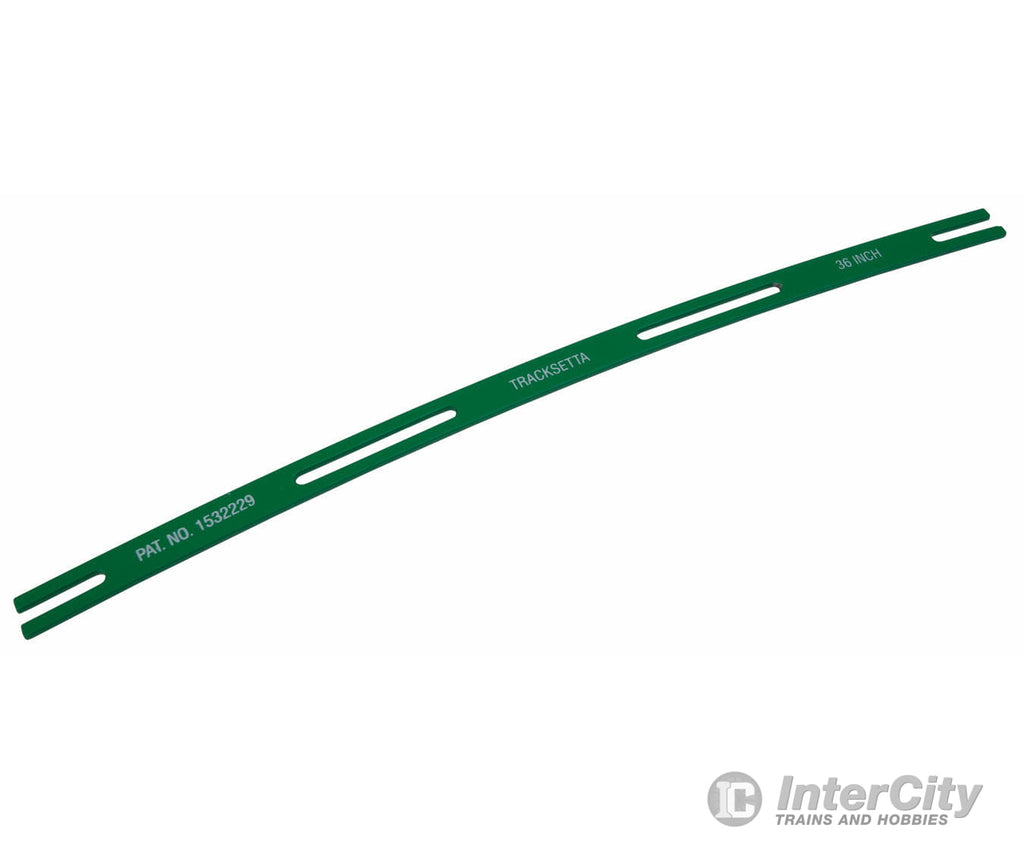Coated steel template makes it easy to lay track with smooth curves and straight lines without dog-legs. Simply fit between the rails to hold the track in position and pin track down through the slots. With Tracksetta, reverse and transition curves can be laid easily and accurately even when working alone. An invaluable aid.