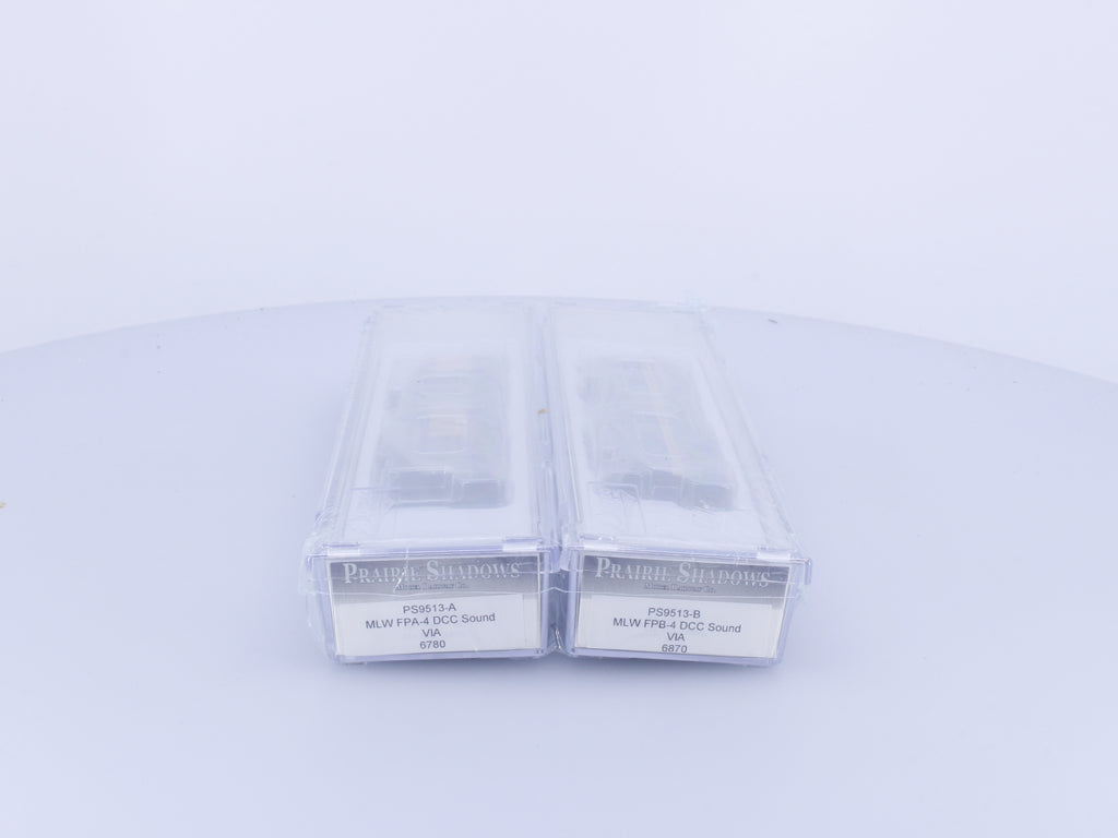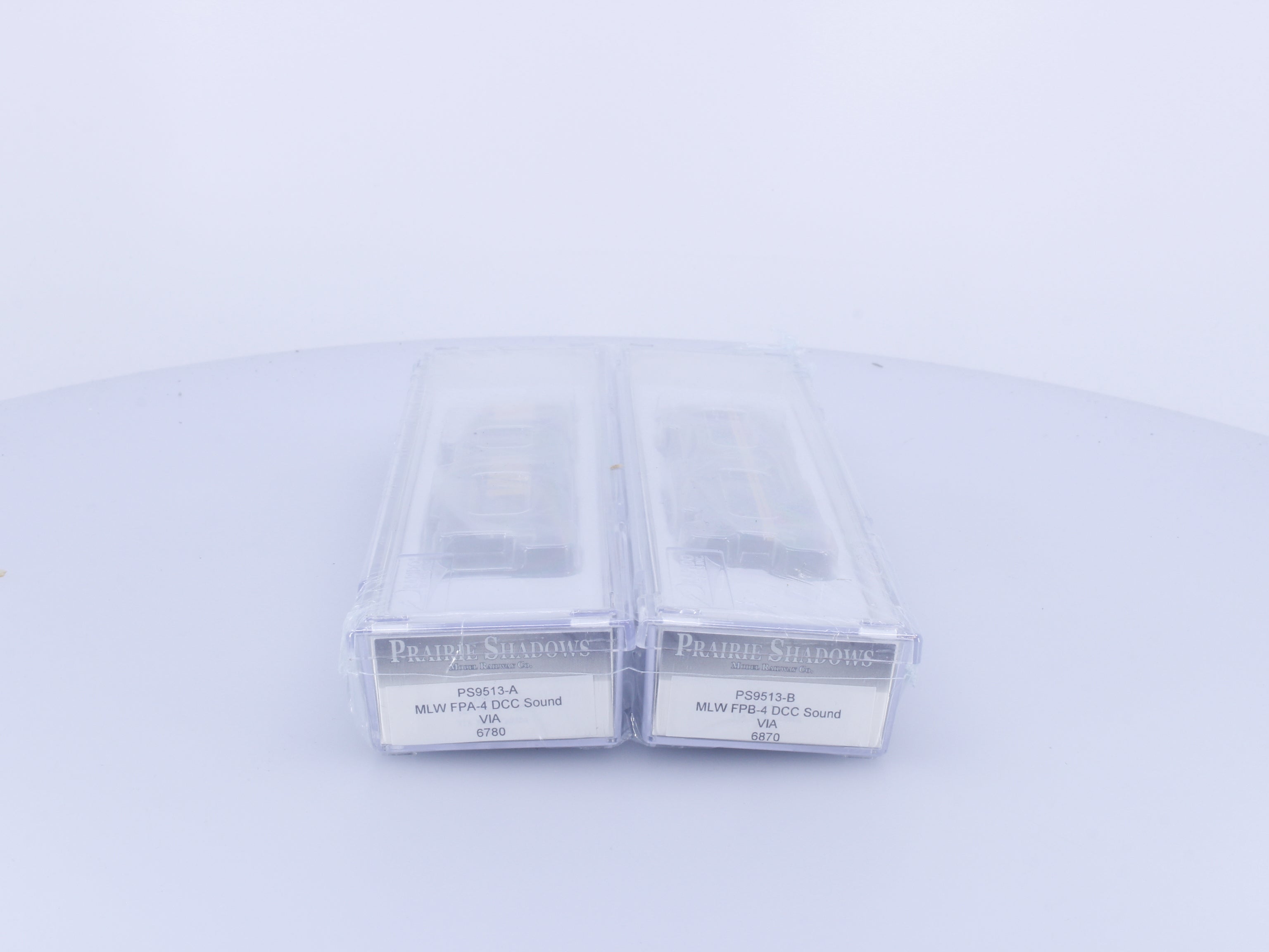 Prairie Shadows Model Railway Co. PS9513-A and B N MLW FPA-4 and FPB-4 Diesel Locomotives Via Rail (VIA) 6780/6870 DCC & Sound