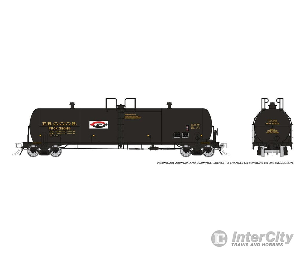 HO Scale Procor GP20 Tank Cars Please welcome back the HO Scale Procor general purpose 20,000 gallon tank car, affectionately known as the Procor GP20 (no, not the locomotive). Founded in 1952, Products Tank Line (renamed Procor in 1962) constructed their manufacturing plant in the mid-1950s in Oakville, Ontario. Initially, engineering was supplied by the parent Union Tank Car Company. In the 1960s, Procor assembled their own engineering department and crafted a series of standard design tank cars which paved the way for a new generation of equipment, with many modern designs reflecting this new standard. The GP20 (again, the tank car and not the locomotive) was suitable for lighter density commodities which would not congeal or freeze in cold weather, such as various oils and fuel. The same car could also be equipped with interior heater coil pipes, such that the contents could be reheated. The same basic design — including tank diameter and length — was manufactured from 1969 through until 1984. The GP20 was constructed with both 70 ton and 100 ton capacity trucks. Later designs were also equipped with a separate fittings dome (in addition to the manway assembly fitting), which allowed the tank rating to be upgraded from 60 psi to 100 psi. When production of the GP20 tank car was completed in 1984, Procor had built almost 1000 cars of this design. They are in use across North America in both fleet service and lease service to numerous companies. Common reporting marks carried by these cars included UTLX (Union Tank Car), PROX (Procor), NCTX (North American Car Co.), BCOL (British Columbia Railway), and CN (Canadian National). The Rapido Trains HO scale Procor GP20 Tank Car features: