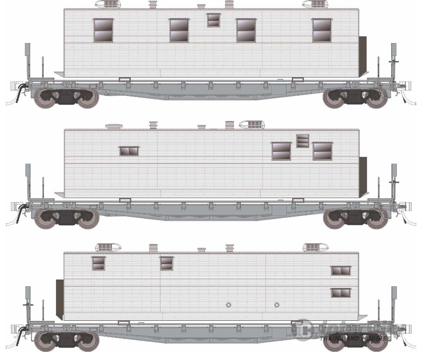 HO Scale MOW F30 Flatcars The Pennsylvania Railroad’s class F30A flatcars was one of their most prolific classes of flatcars with 1500 being built between 1933 and 1934. The PRR utilized a massive one-piece steel casting for these F30 flatcars, and that sturdy construction meant that many of these cars lasted an incredibly long time, often with a second life in work train (MOW) service. Camp Cars: In the 1980s Conrail (and other railroads) mounted pre-fabricated “vans” on flatcars to house tack workers. Several common styles of van were built to serve the various needs of the work crews. These “Camp Trains” were familiar sights on Conrail and still exist on Norfolk Southern and other roads. Rapido offers four different camp car body styles: sleeper, diner, kitchen and office. We also offer each style van separately. They are perfect offices for yards, engine terminals, construction sites, and have all sorts of other applications! Separate vans are painted in appropriate colours but are unlettered. Wheel Transport Flatcars: New in this release are wheel transport flats with loads. Wheel cars usually travel in mixed manifests to transport wheels from shop to shop as needed. Our wheel flat features deck mounted wheel racks with a pre-decorated wheel load. Continuous Welded Rail (CWR) Cars: Also new are Continuous Welded Rail (CWR) cars. CWR cars carry racks that house sticks of welded rail. These cars generally travel in sets of 12 or 24 cars and often shut down mainlines for hours at a time while they drop off rail! Our CWR flat features a new deck with deck mounted rail racks. Tie Cars: Several ex-TTX F30 flat cars were purchased by BN and converted to carry concrete ties. Most are still in service with BNSF today! Our tie car model is based on these BN/BNSF conversions and features a correct deck, tie rack and decorated concrete crosstie load. HO Scale F30A and F30D MOW Flatcar Features: