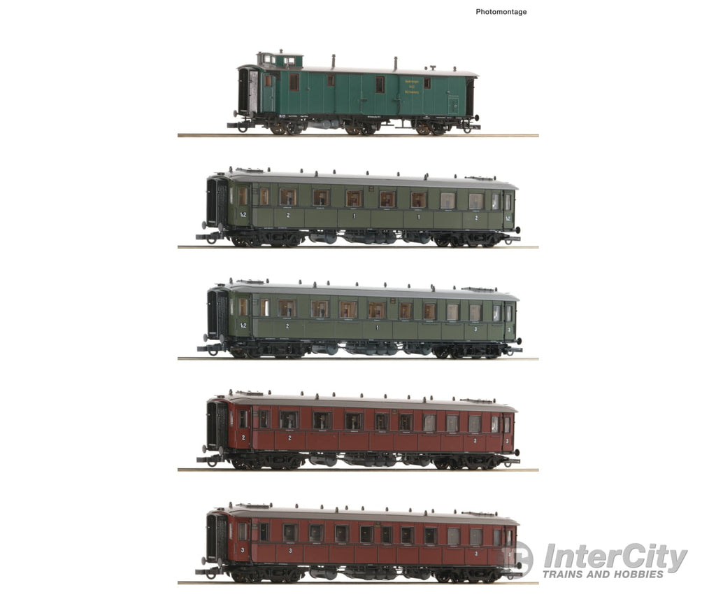 The set contains a 1st/2nd class coach, type ABBü, a 1st/2nd/3rd class coach, type ABCCü, a 2nd/3rd class coach, type BCCü, a 3rd class coach, type CCü, and a baggage wagon, type Gep.