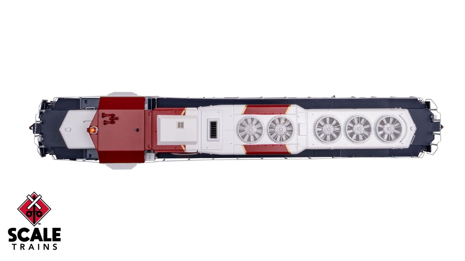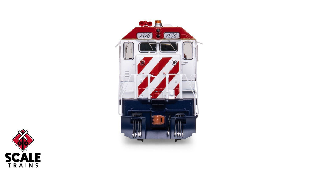 - Front EMD-style high pilot plow without multiple unit (MU) hose doors and grab irons and rear multiple unit (MU) hose catch tray