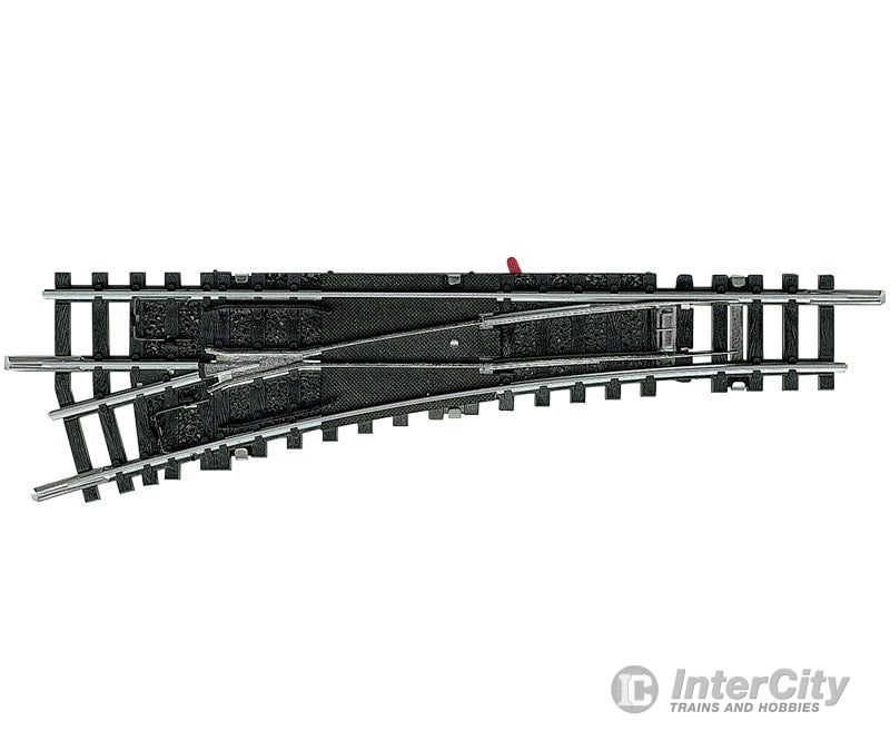 Minitrix 15° Turnouts with a Polarized Frog. Straight side of the turnout |< 112.6 mm / 4-7/16 >|.Branch radius = R 4 - 15° + 1 x 14903.Optional Stop Turnout function included.An electric turnout mechanism can be installed on these turnouts.