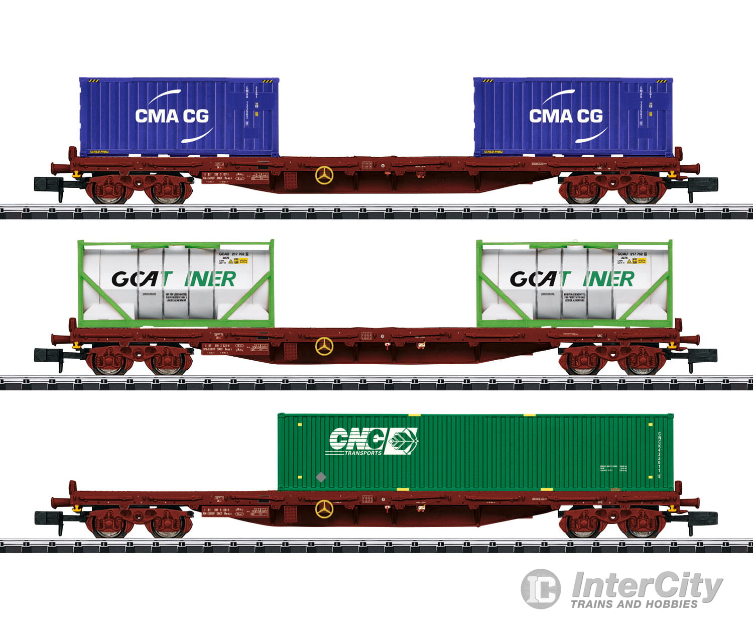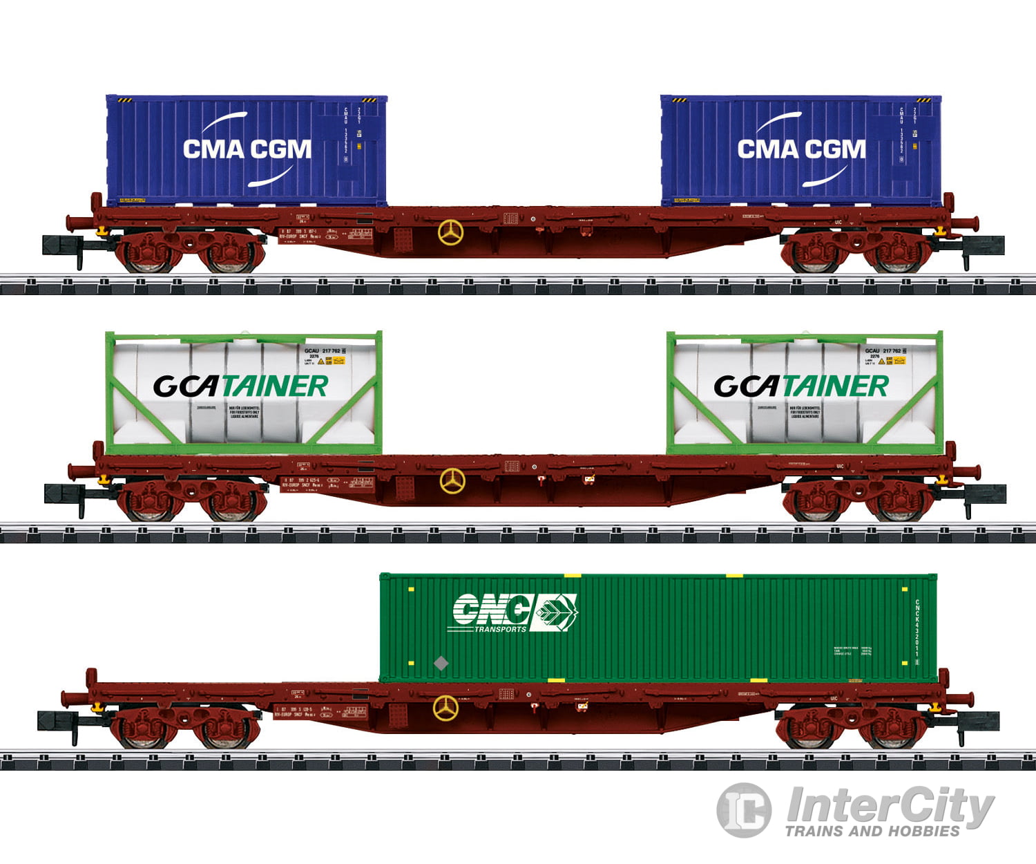 Prototype: 3 SNCF type Rs four-axle flat cars with stakes. Loaded with different interchangeable containers: 20-foot containers, 20-foot tank containers, and newly designed 40-foot containers. The cars and containers look as they did around 2004.