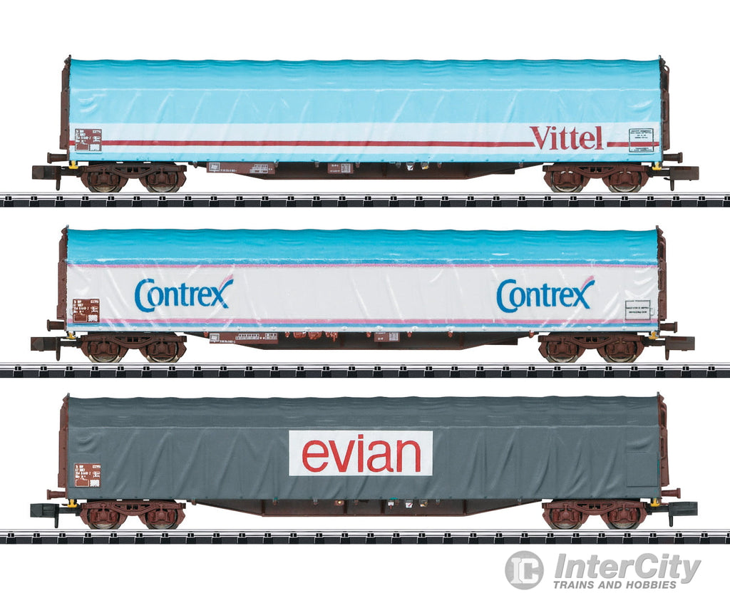 Prototype: Three (3) French State Railways (SNCF) type Rils sliding tarp cars. European standard car with a length of 19.90 meters / 65 feet 3-7/16 inches. Version with a single-piece tarp and rectangular buffers.