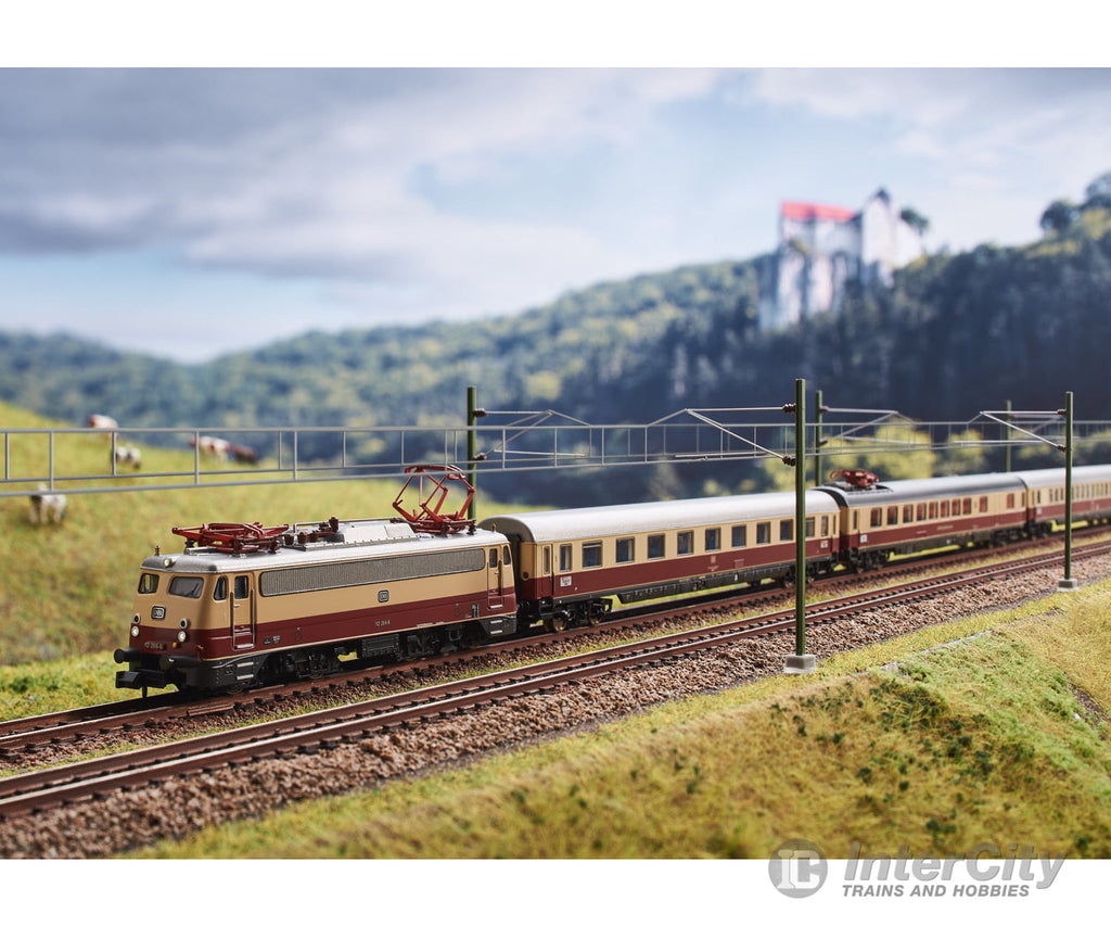 Prototype: German Federal Railroad (DB) standard design electric locomotive, road number 112 269-6. Express locomotive with aerodynamic ends, including the so-called Bügelfalte / Pants Crease. Basic paint scheme in crimson/ivory. Continuous rain gutter, skirting, and buffer cladding included. The locomotive looks as it did around 1974.Use: Passenger trains in long-distance service and occasionally in commuter and freight service.