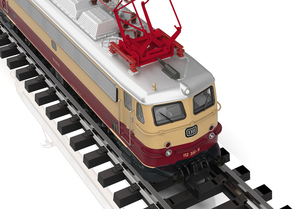 Prototype: German Railroad, Inc. (DB) standard design electric locomotive, road number 112 310-8. Express locomotive with aerodynamic ends, with the so-called "Pants Crease". Crimson / ivory basic paint scheme. Continuous rain gutter, skirting, and buffer sheathing. The locomotive looks as it did around 1971 for the TEE "Rheinpfeil".Use: Passenger trains in long-distance service and occasionally also in commuter and freight service.
