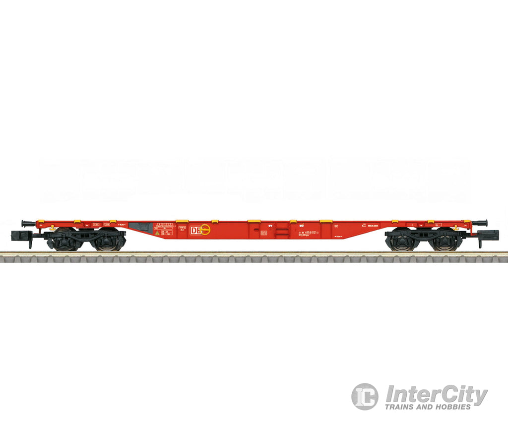 Prototype: German Railroad (DB AG) four-axle type Sgns unloaded container transport car. Traffic red basic paint scheme. The car is prepared to carry containers from items 66588 and 66589 (60 ft together).