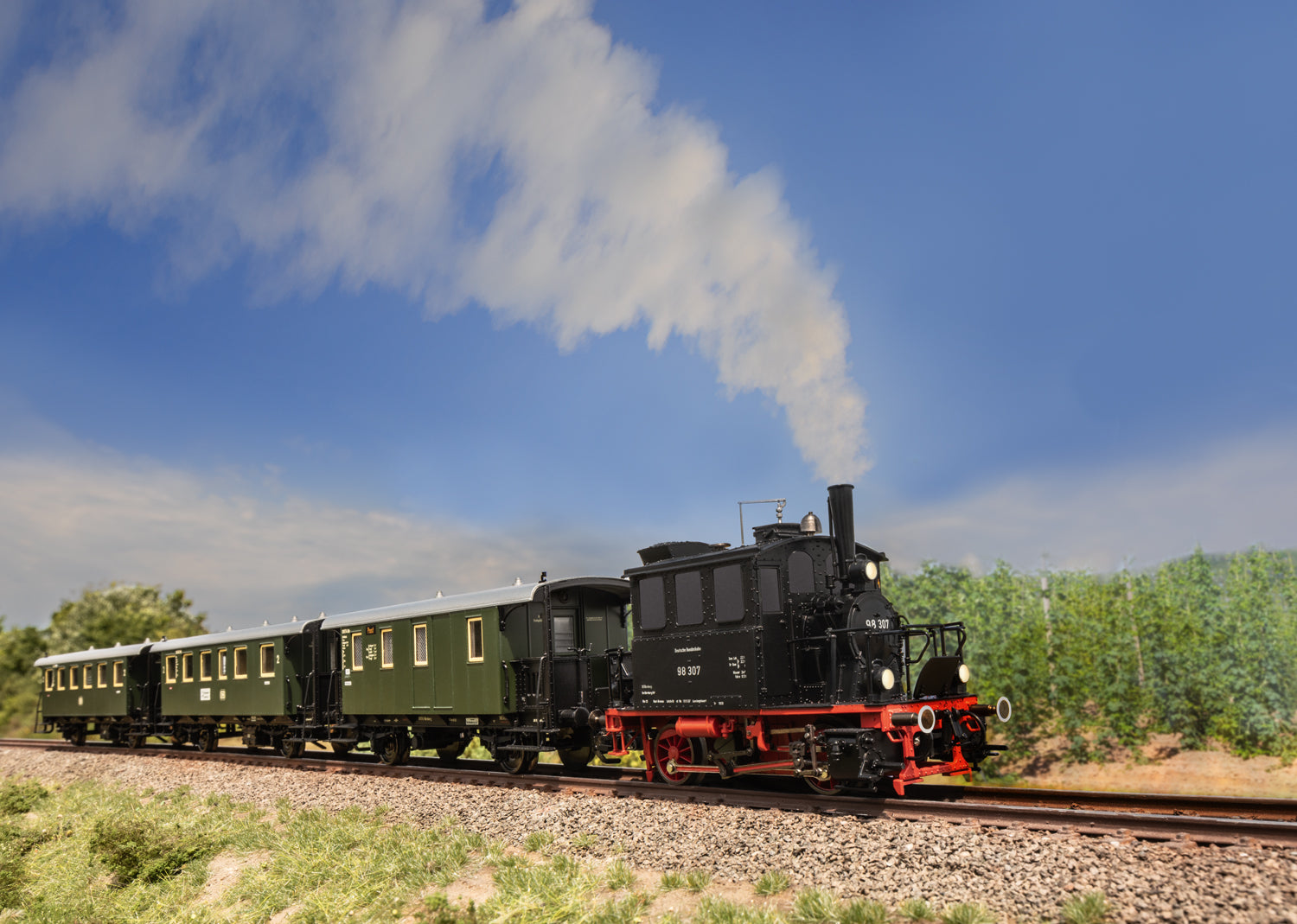 Prototype: German Federal Railroad (DB) class 98.3 "Glaskasten" ("Glass Box") (former Bavarian PtL 2/2) with a jackshaft and triple headlights and three Bavarian style local railroad cars. One baggage and mail car and two passenger cars, 3rd class. The cars look as they did in Era III around 1957.
