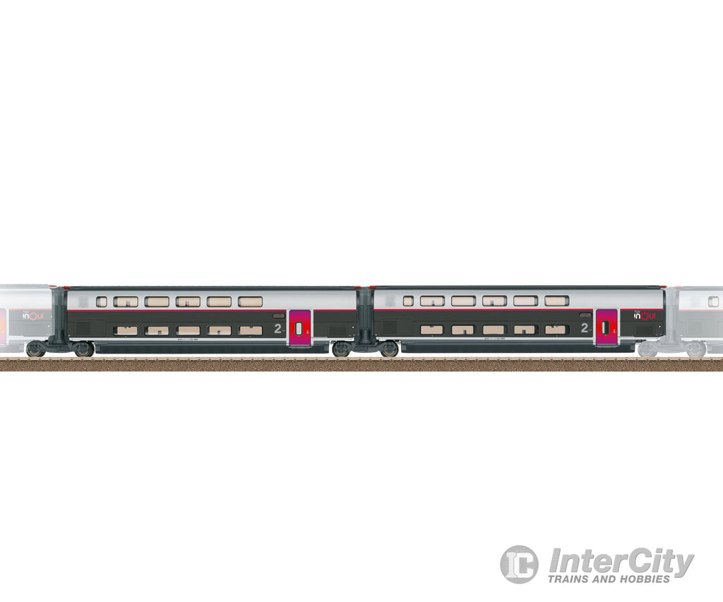 Model: This is a 2-part add-on car set for extending the TGV INOUI high-speed train, item 22482, to a ten-car train. The cars feature factory-installed interior lighting with maintenance-free warm-white LEDs. A continuous electrical connection through the entire train supplies the interior lighting with power. Both intermediate cars are permanently coupled. The Jakobs trucks are equipped with a guide mechanism. The cars are a scale reproduction, which means the minimum radius for operation is 360 mm / 14-3/16" with sufficient clearance on both sides.