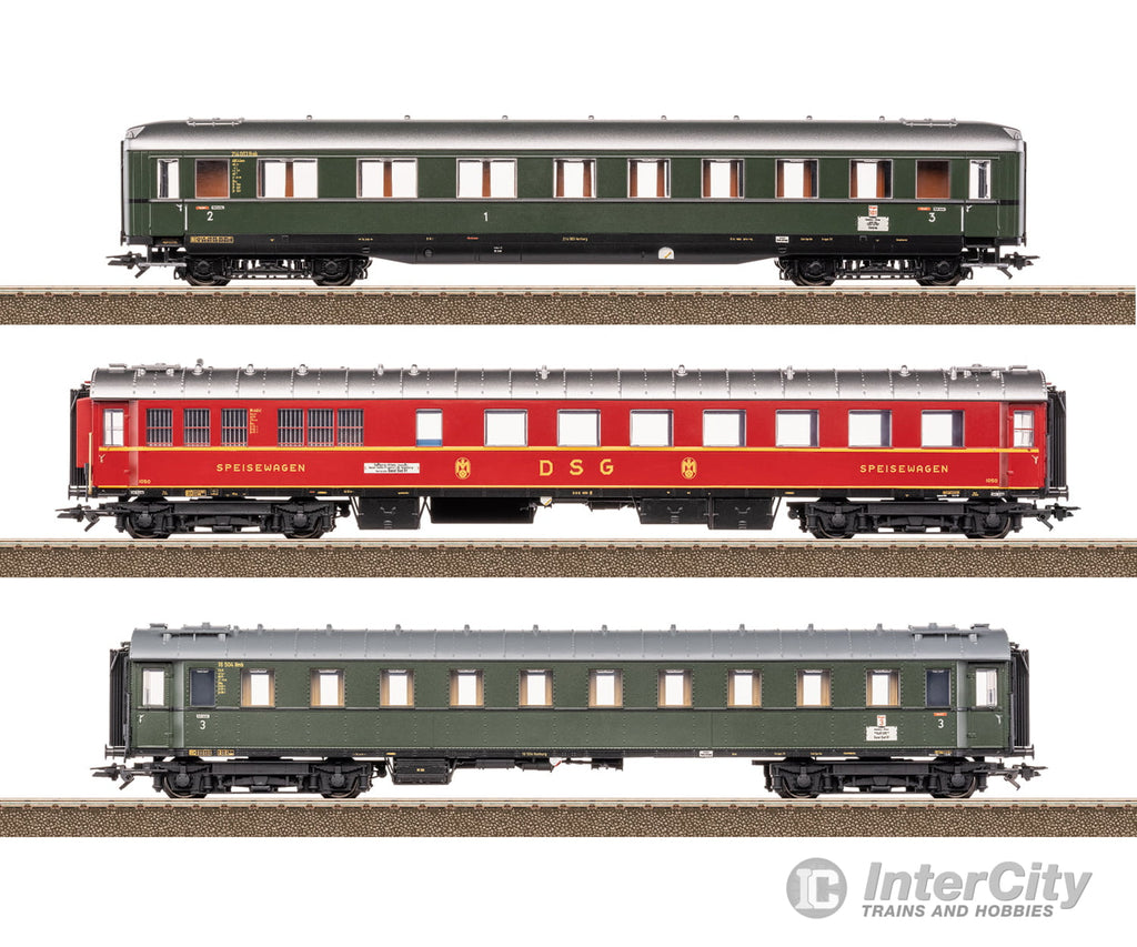 Prototype: An express train passenger car set comprising the following three cars of different types for the "D 74" express train. 1 type ABC4üwe four-axle skirted passenger car, 1st/2nd/3rd class. 1 DSG type WR4ü(e) four-axle dining car (standard design 1928-30). 1 type C4ü four-axle seating car, 3rd class (standard design 1928-30). Train route: D 74 Hamburg Altona-Basel SBB, for the Frankfurt/Basel SBB section of the route. German Federal Railroad (DB) and German Sleeper and Dining Car Company (DSG). The cars look as they did around 1955.