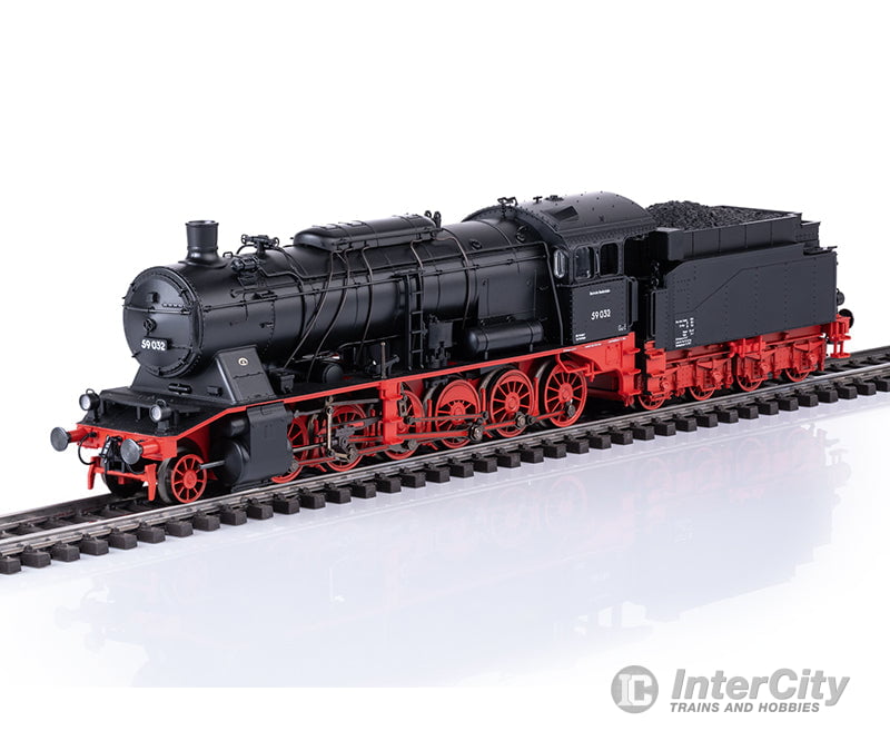 Prototype: Class 59 (former Württemberg class K) heavy freight steam locomotive with a type 2 2 T20 coal tender. German Federal Railroad (DB). Black basic paint scheme with red running gear. Road number 59 032. Based in the Stuttgart District, Plochingen maintenance facility. The locomotive looks as it did around 1949.