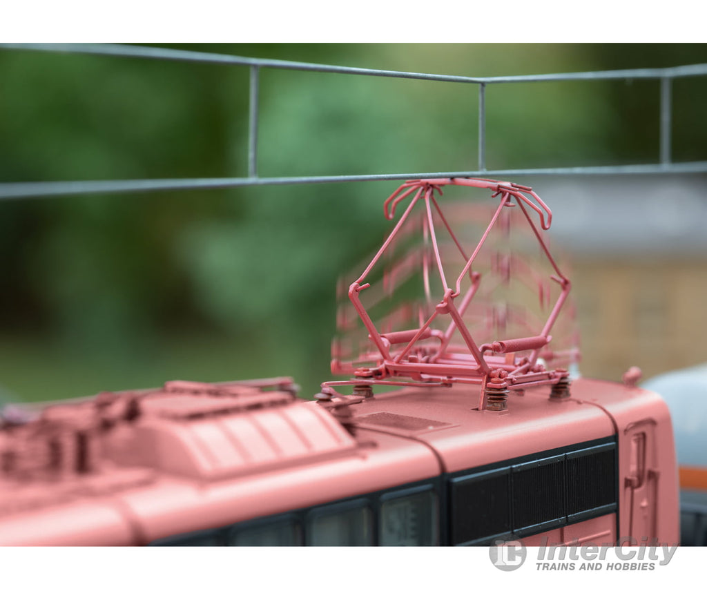 Model: The locomotive has an digital decoder and extensive sound functions. It also has controlled, high-efficiency propulsion with a flywheel, centrally mounted. Two axles powered in each truck using cardan shafts. Traction tires. Triple headlights and dual red marker lights change over with the direction of travel, will work in conventional operation, and can be controlled digitally. The headlights / marker lights at Locomotive Ends 2 and 1 can be turned off separately in digital operation. There is a double "A" light function. Cab lighting changes over with the direction of travel. It and the engine room lighting can be controlled digitally. In addition, an approach lamp changes over with the direction of travel and can be controlled digitally. Maintenance-free, warm white and red LEDs are used for the lighting. A buffer capacitor is included. The roof equipment is detailed with DBS 54 pantographs. The pantographs can be raised and lowered digitally. There are many separately applied parts such as wheel imitations, grab irons, sand boxes, UIC sockets, and roof conductors. The buffer height conforms to the NEM. There is a figure of a locomotive engineer sitting in Cab 1. Brake lines, prototype couplers, and various sockets are included separately for installation on the locomotive. Length over the buffers 22.4 cm / 8-13/16".