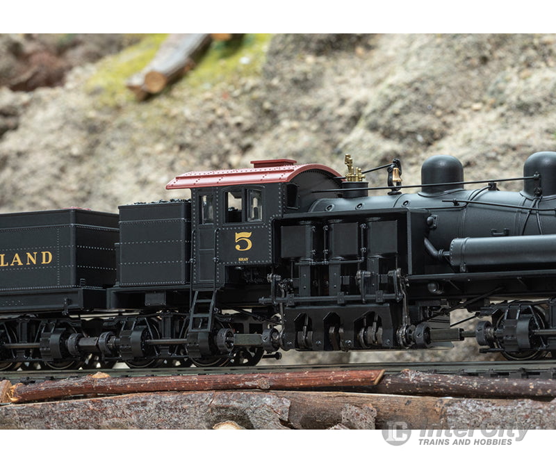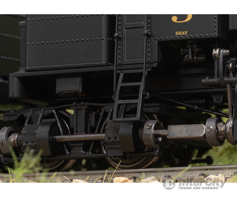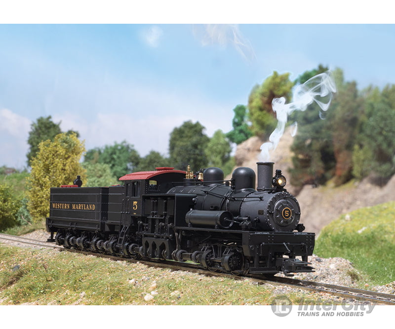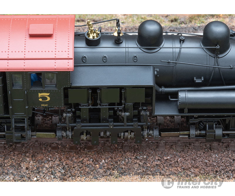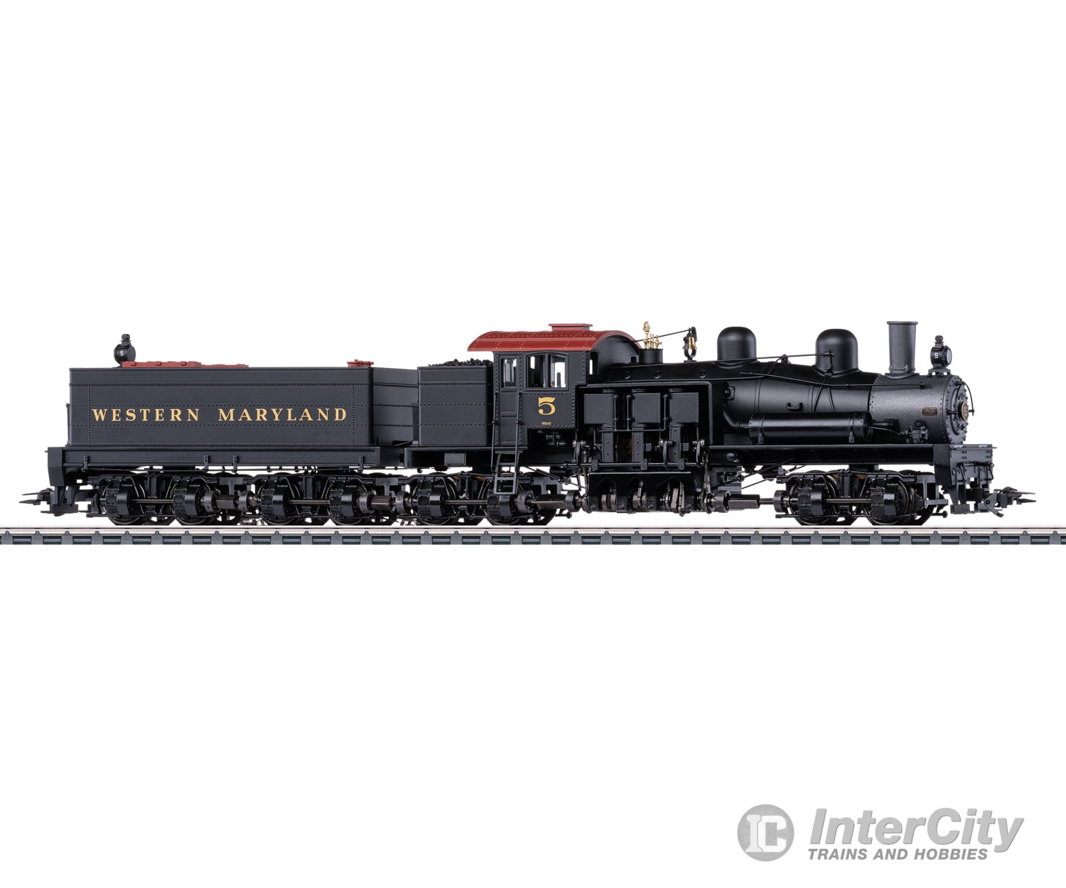Prototype: US Shay design Class D gear drive steam locomotive. Version with 4 powered trucks. Drive using crankshafts to articulated shafts and using beveled gears on the trucks. Characteristic boiler offset to the left included. Used mostly on American field and logging railroads on routes with sharp curves and steep grades. Western Maryland Locomotive Number 5. The locomotive looks as it did in the Forties.
