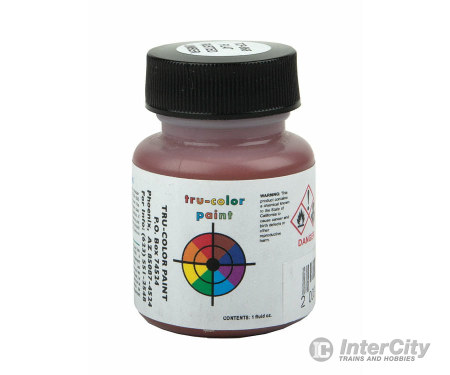 Tru-Color Railroad Color Acrylic Paint is a line of airbrush-ready paint accurately matched to colors used by railroads across the continent. The acrylic solvent based paint that is designed to be airbrushed directly from the bottle without thinning. The paint is designed for use on plastic models with no priming necessary, although you can use a primer if desired. Brass models must be sandblasted or treated before applying Tru-Color or the paint will not adhere properly. No additional gloss coat is necessary before applying decals to gloss or semi-gloss colors. Use acetone for airbrush cleanup, but do NOT thin Tru-Color Paint with acetone. Recommended airbrush pressure is 28 to 35psi. Not mixable with any other brands of paint, but can be sprayed over most fully cured colors from other manufacturers (experiment on a small section before proceeding).