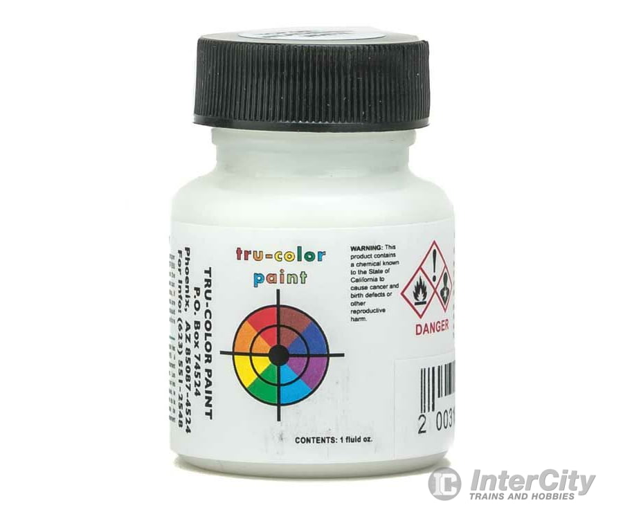 Tru-Color Railroad Color Acrylic Paint is a line of airbrush-ready paint accurately matched to colors used by railroads across the continent. The acrylic solvent based paint that is designed to be airbrushed directly from the bottle without thinning. The paint is designed for use on plastic models with no priming necessary, although you can use a primer if desired. Brass models must be sandblasted or treated before applying Tru-Color or the paint will not adhere properly. No additional gloss coat is necessary before applying decals to gloss or semi-gloss colors. Use acetone for airbrush cleanup, but do NOT thin Tru-Color Paint with acetone. Recommended airbrush pressure is 28 to 35psi. Not mixable with any other brands of paint, but can be sprayed over most fully cured colors from other manufacturers (experiment on a small section before proceeding).