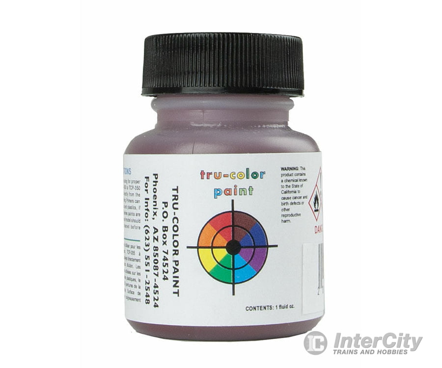 Tru-Color Railroad Color Acrylic Paint is a line of airbrush-ready paint accurately matched to colors used by railroads across the continent. The acrylic solvent based paint that is designed to be airbrushed directly from the bottle without thinning. The paint is designed for use on plastic models with no priming necessary, although you can use a primer if desired. Brass models must be sandblasted or treated before applying Tru-Color or the paint will not adhere properly. No additional gloss coat is necessary before applying decals to gloss or semi-gloss colors. Use acetone for airbrush cleanup, but do NOT thin Tru-Color Paint with acetone. Recommended airbrush pressure is 28 to 35psi. Not mixable with any other brands of paint, but can be sprayed over most fully cured colors from other manufacturers (experiment on a small section before proceeding).