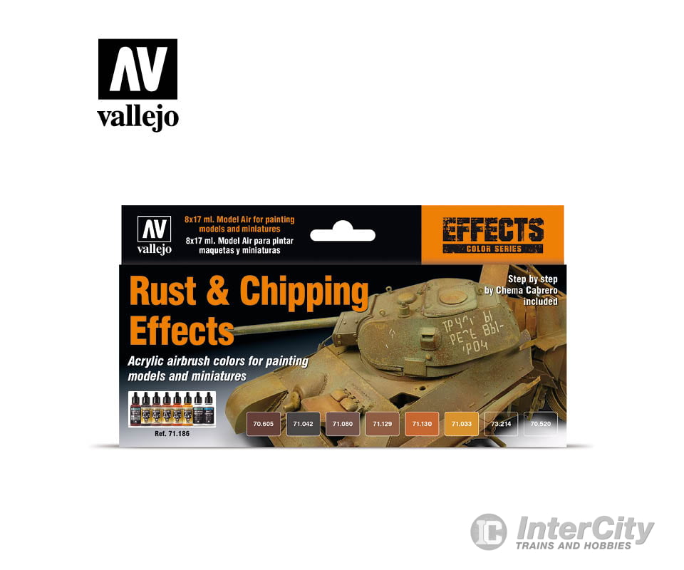 Selection of airbrush colors to create the effects of rust and wear caused by exposure to weather and battle conditions. Includes step by step by Chema Cabrero.