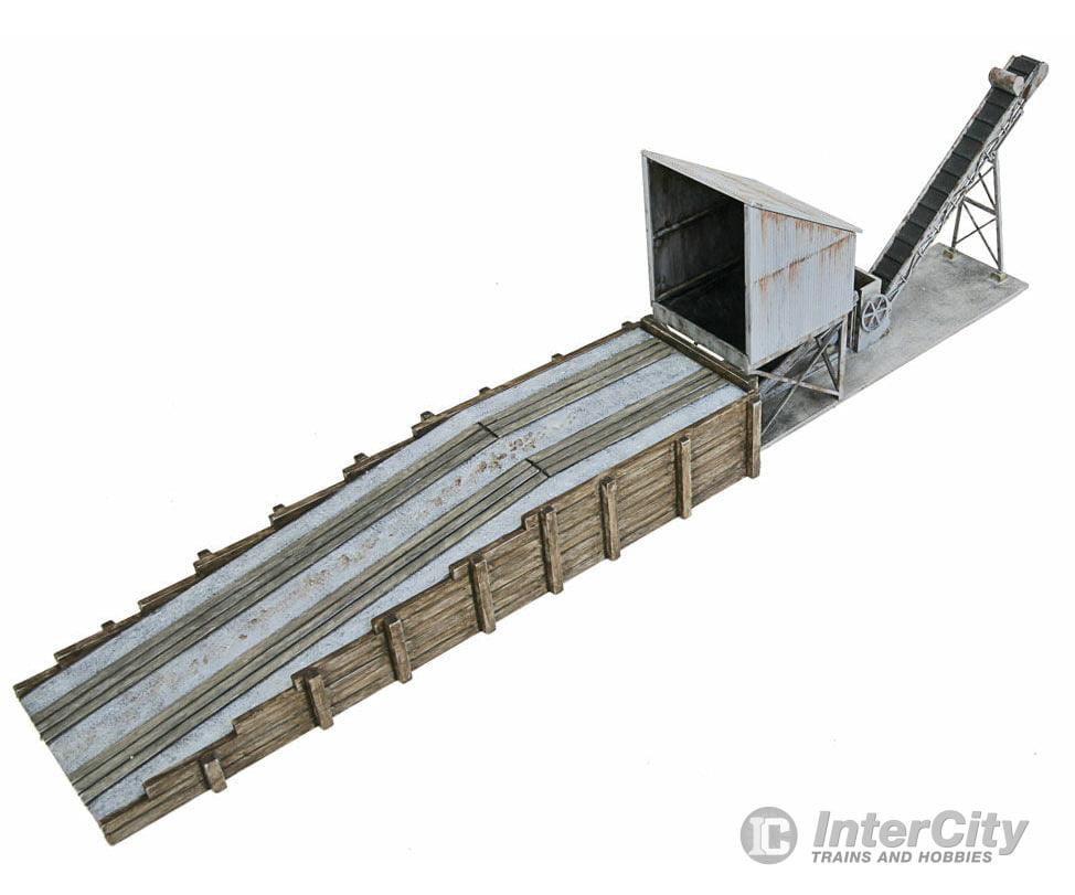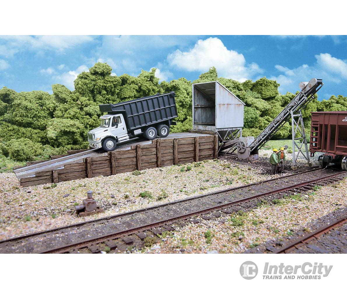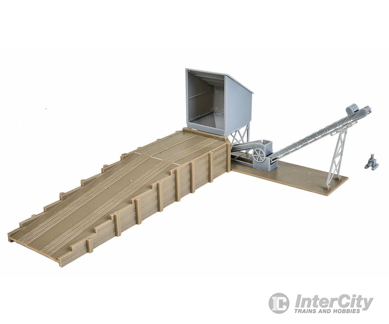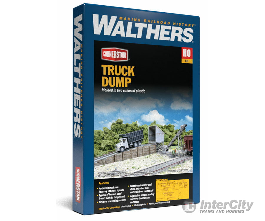 The Walthers Cornerstone Truck Dump kit is based on authentic facility used for loading all kinds of materials from dump trucks into hoppers or gondolas. This kit includes a timber-supported gravel truck ramp, corrugated-metal dump house and hopper, a positionable hopper loading conveyor that can be arranged left, right or center, and a car puller. Use the Truck Dump to add a shipping facility to any siding on your 1970s and later layout.