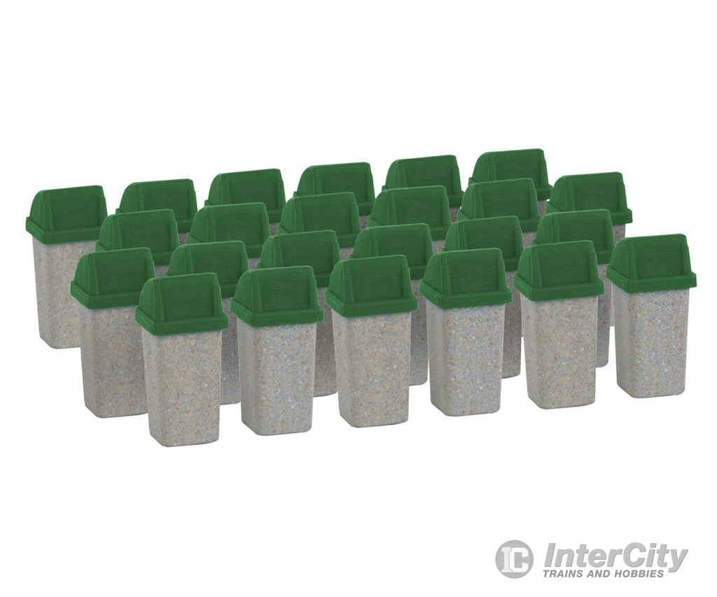 Keep your contemporary HO Scale city clean with these SceneMaster authentic replicas of Modern Trash Cans. Found outside all kinds of businesses, in parks and alongside other public buildings, these one-piece models feature a detailed lower base and cover, and are easily customized with a bit of paint (sold separately). Set includes 24 Trash Cans. These scenery details are part of the wide range of SceneMaster scenery materials.