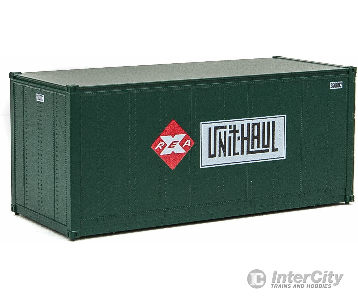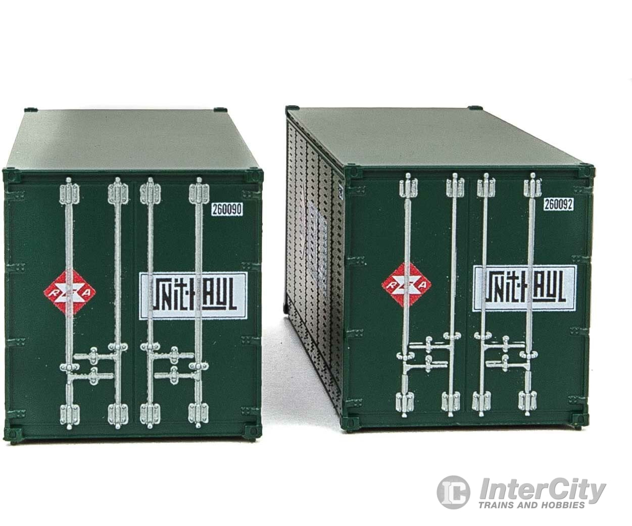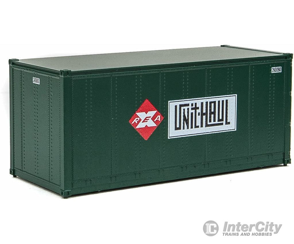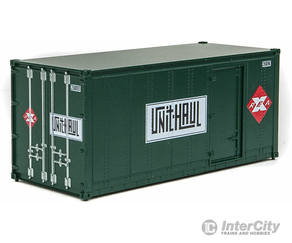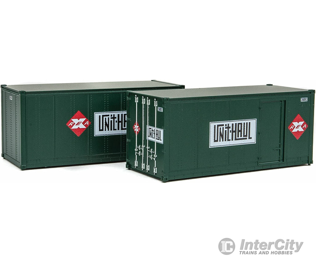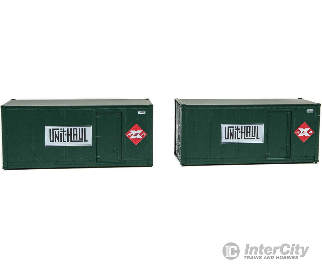 Walthers SceneMaster 8680 20' Smooth-Side Container with Right Side Door 2-Pack - Ready to Run -- Railway Express Agency #260090, 260092 (green, red; Unit Haul Logo)