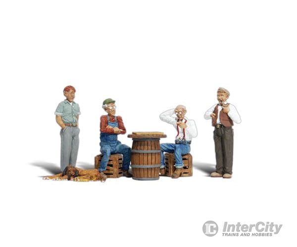 Two men sit at an old whiskey barrel playing checkers. One scratches his head, trying to decide his next move, while the other waits. A man smokes a pipe and another observes the game, with his hands in his pockets. An old hound dog flops down to rest, his tongue hanging out.