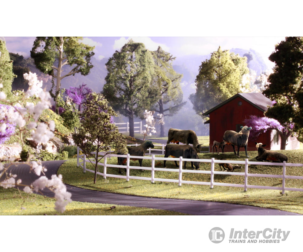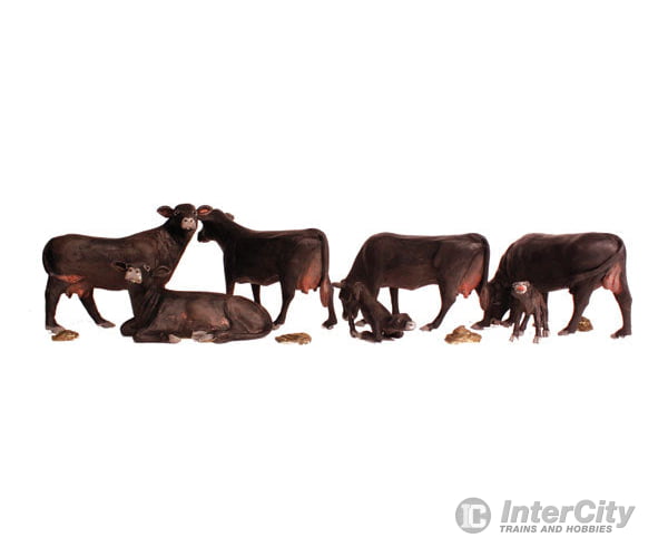 Black Angus cows and calves, in various poses, hang out in the pasture.