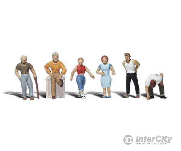 You might see these people on any street. A man is bending over to pick up something. A woman is waving "hi." A man walks down the street with his cane and a strong, young man, clad in a muscle shirt stands looking around. A woman is out for a walk and a man leans against a wall.