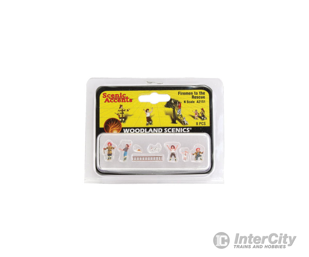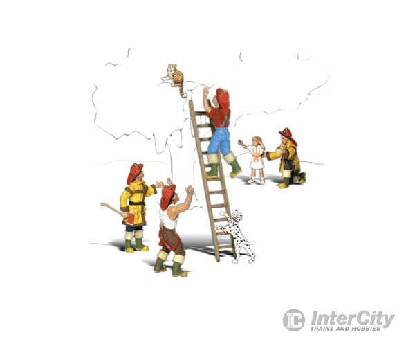 A set of four firemen, a little girl, a dog, cat and a ladder. One fireman is caring for the little girl, one fireman is signaling above his head, one fireman is standing, looking up at another fireman on a ladder who is rescuing a cat from a tree.