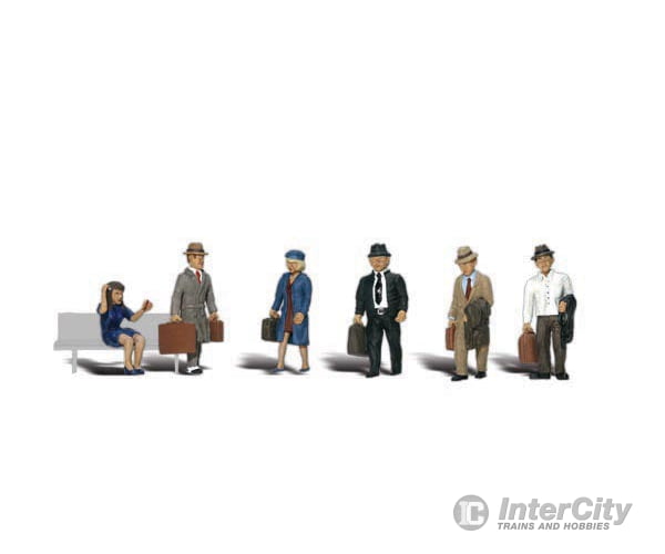 One woman is sitting and waving, one woman has luggage, a man has suitcases, another man has a coat and a suitcase and two men walk with suitcases.