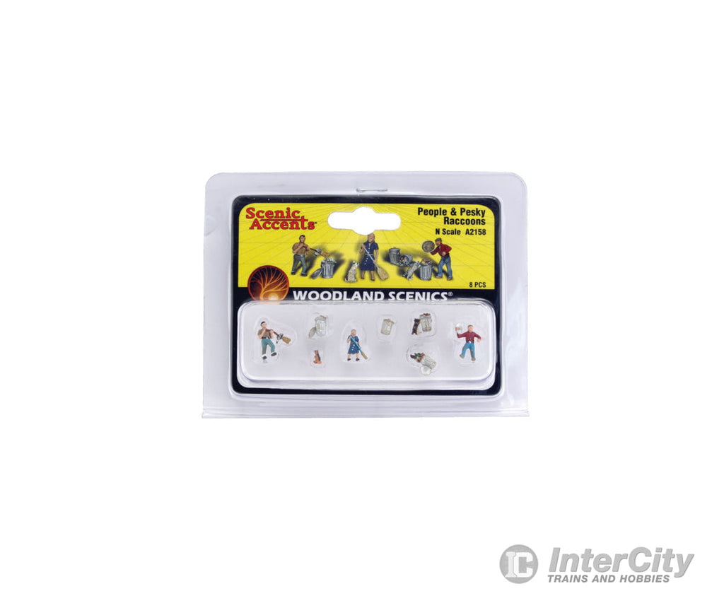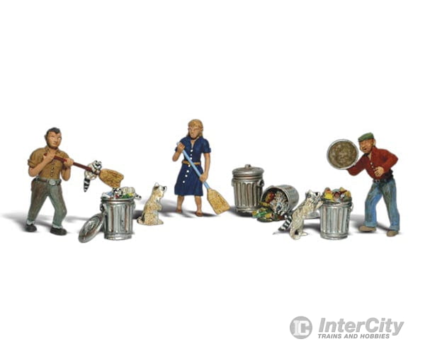 A set of men and a woman with a broom try to shoo three pesky raccoons. There are opened trashcans and one is spilled over.