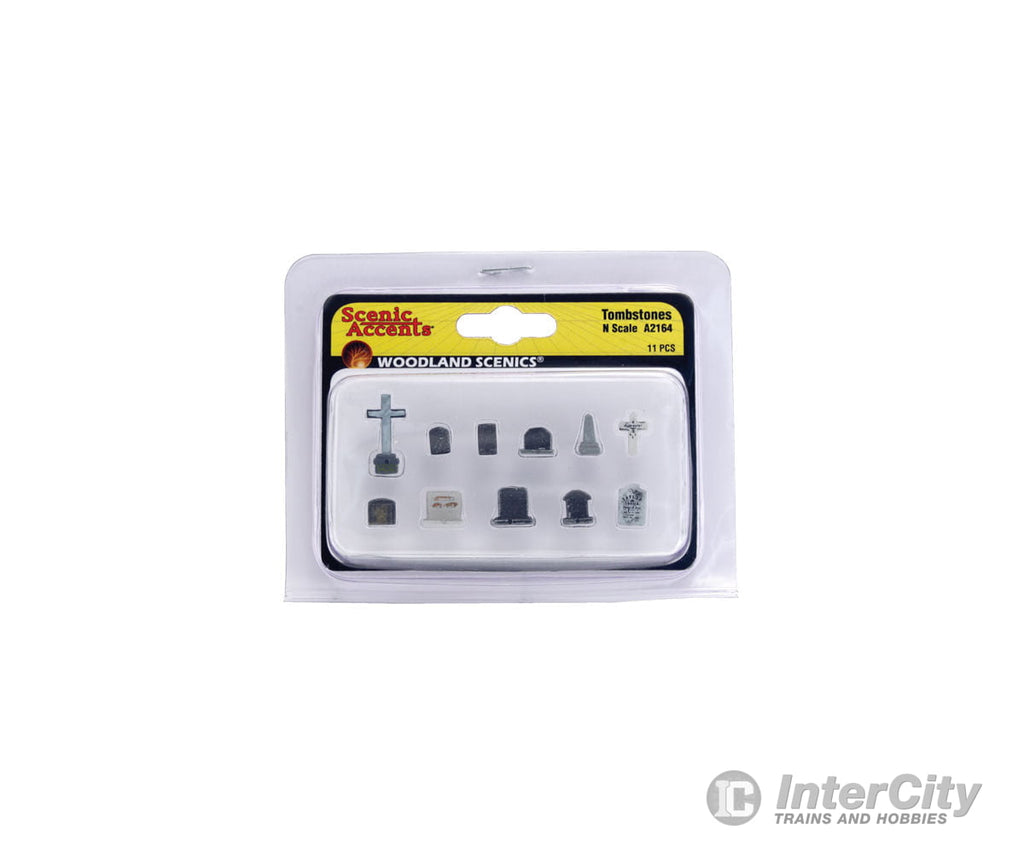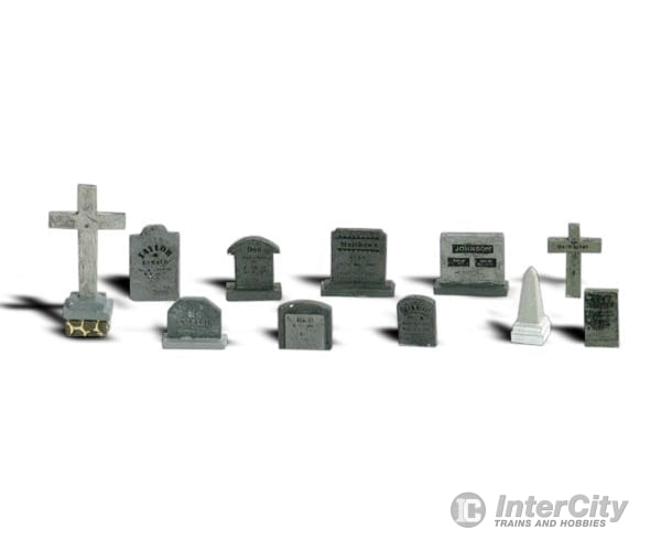 Eleven pieces are included in this assortment of square, rounded, cross and obelisk tombstones.