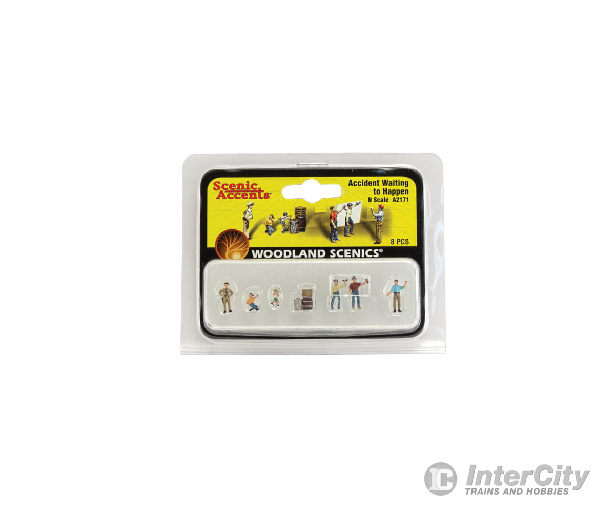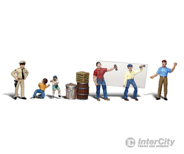 A set of three glass workers. One glazer guides the two others, who are carefully carrying a very large pane of glass with suctions cups. Two boys hide behind trash barrels with their slingshot loaded, ready to shoot, with a policeman watching.